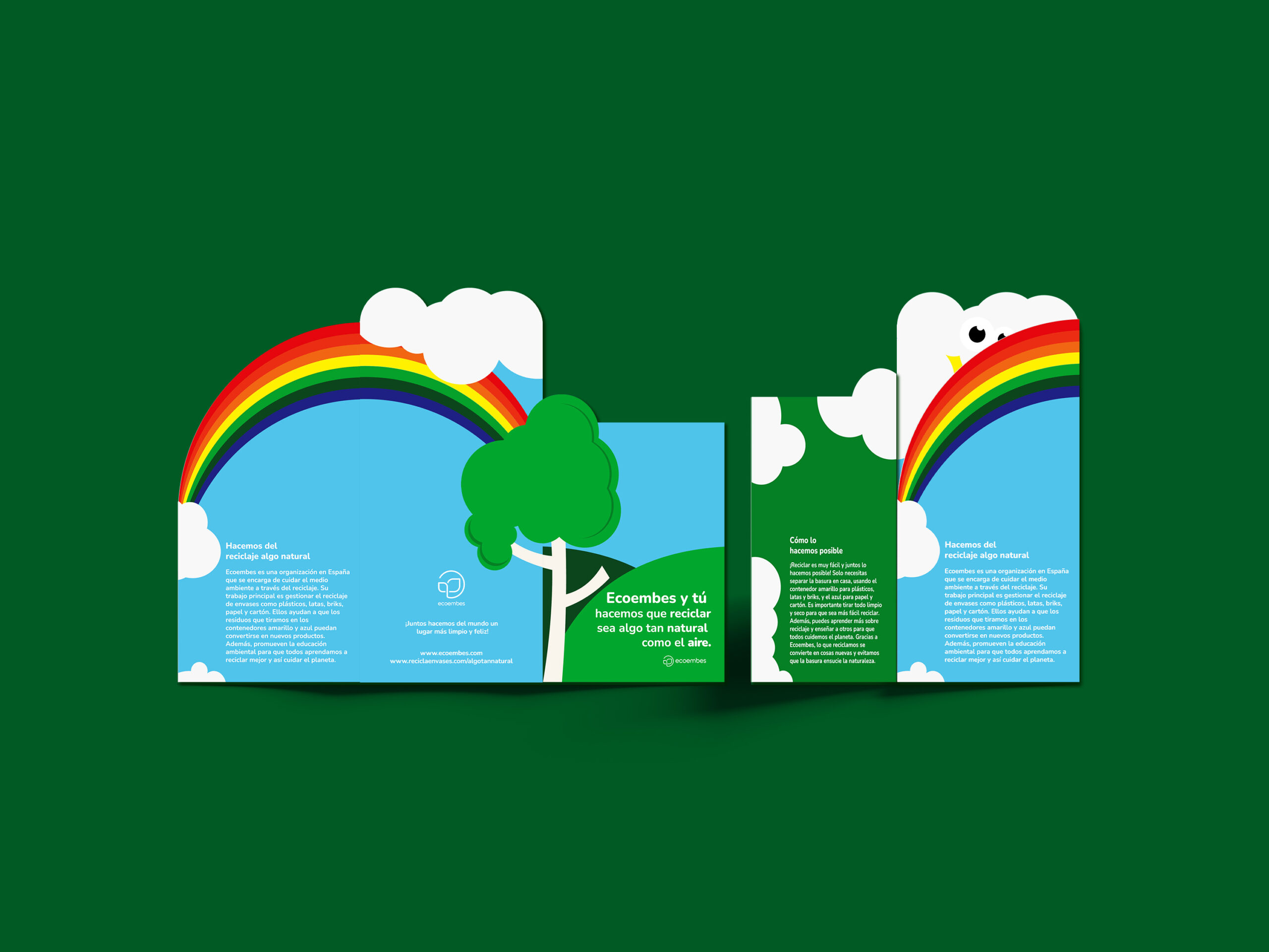 Para este proyecto, diseñe un folleto informativo para Ecoembes, una organización dedicada a la gestión y reciclaje de envases en España. El encargo consistía en crear una pieza dirigida a escuelas y colegios, con un diseño coherente con la identidad ecológica de la marca. El objetivo era comunicar, de forma clara y atractica, cómo Ecoembes hace posible el reciclaje y promover la conciencia y medioambiental entre los más jóvenes.
